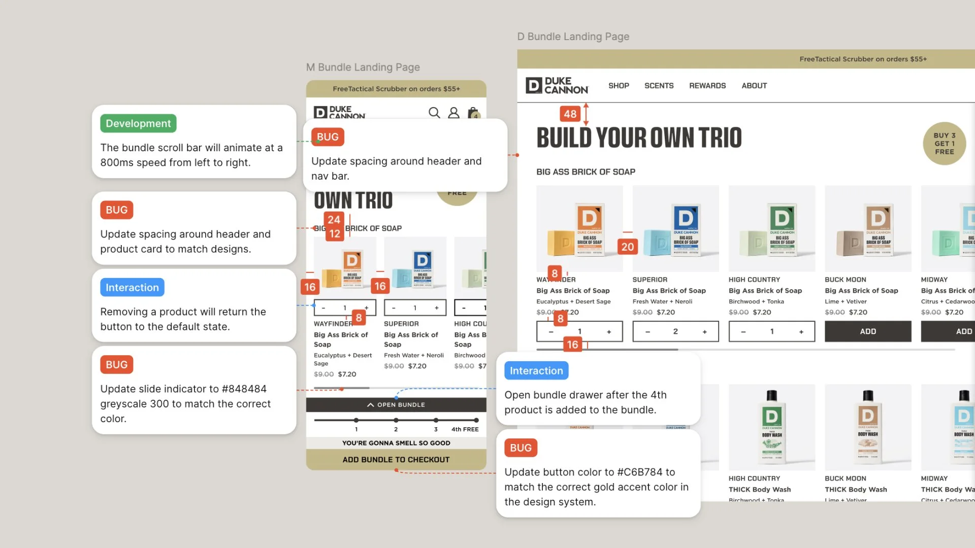 Detailed annotations and specifications translated the bundle builder design into a precise engineering handoff, reducing back and forth during development. QA testing across browsers, devices, and interaction states caught issues early and kept both efforts aligned through to launch. The final experience matched the design vision with fewer revision cycles and a smoother rollout.