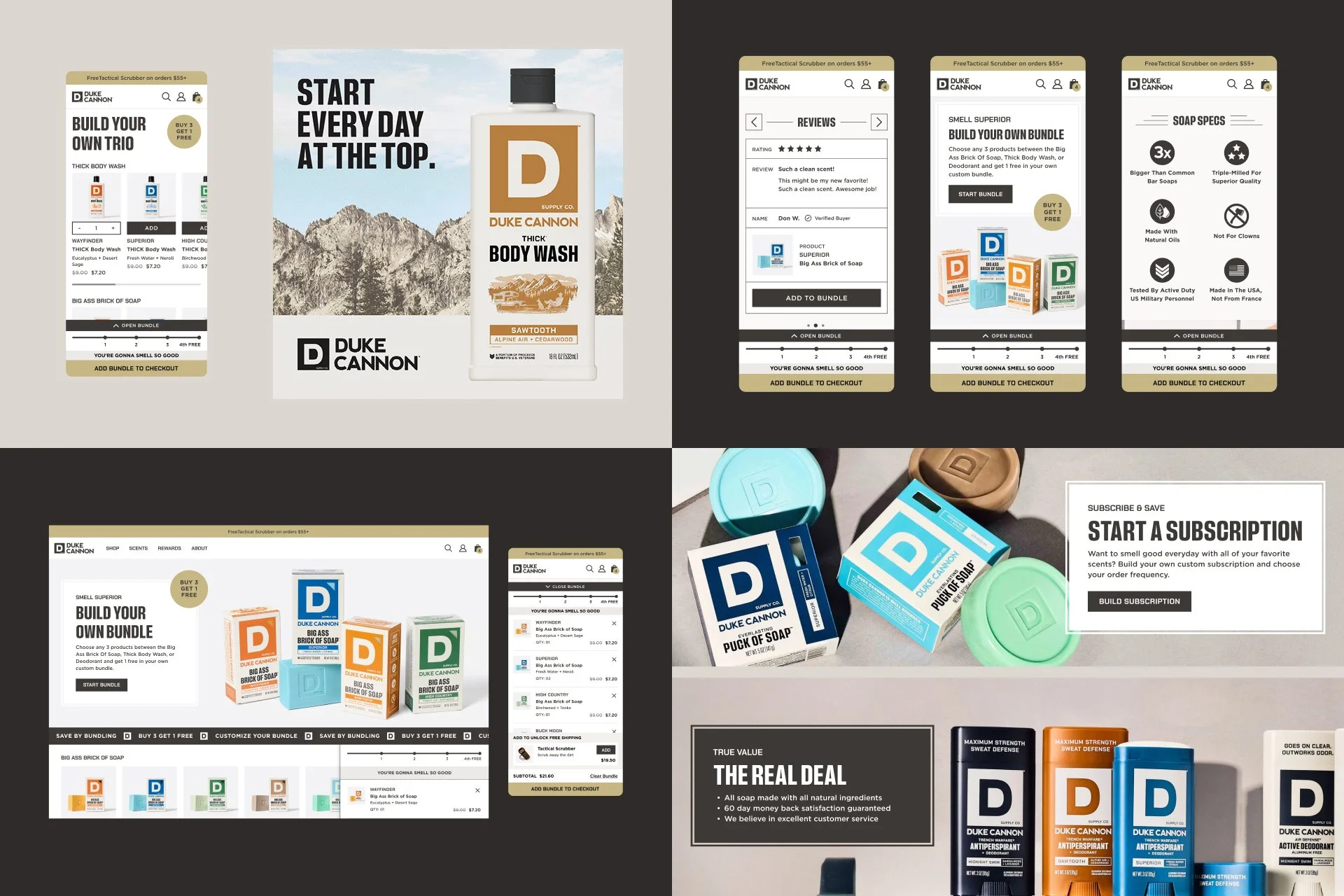 Duke Cannon creates premium grooming products for hard-working men. After rebranding their packaging and shifting focus to a new target audience, their digital experience felt disconnected from the updated physical brand and wasn't optimized for conversions or subscriptions. The problem was that customers had no way to customize their purchases, and the rigid product structure limited subscription growth.