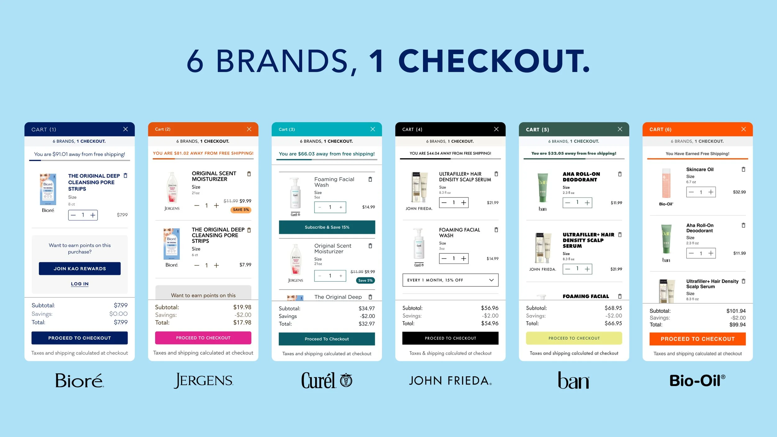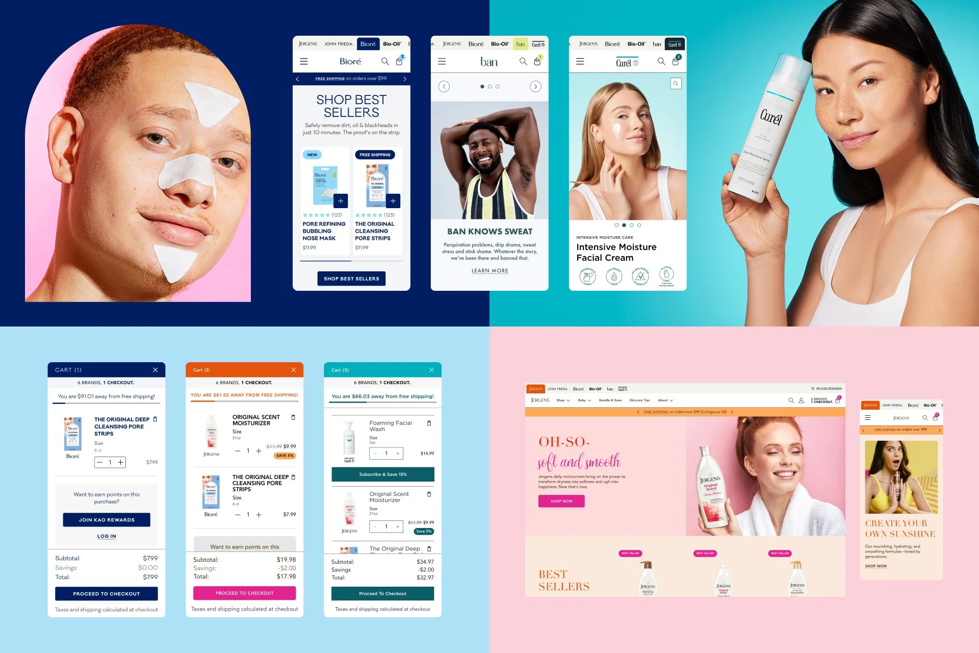 KAO is a parent company managing six beauty and skincare brands: Bioré, John Frieda, Curel, Bio-Oil, Ban, and Jergens. Each brand operated independently with no shared shopping functionality. Customers couldn't purchase products from multiple brands in one transaction, and checkout abandonment was extremely high.