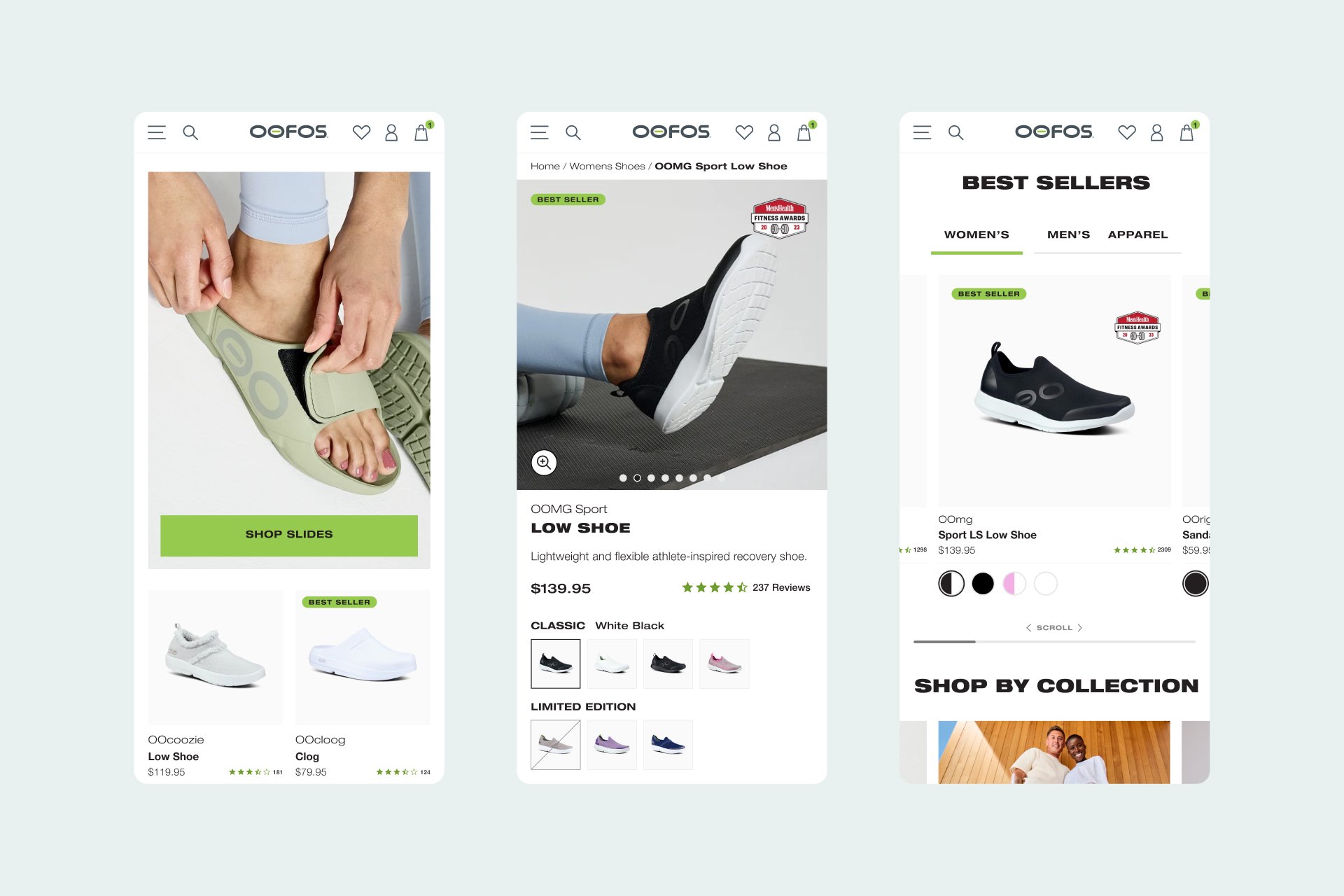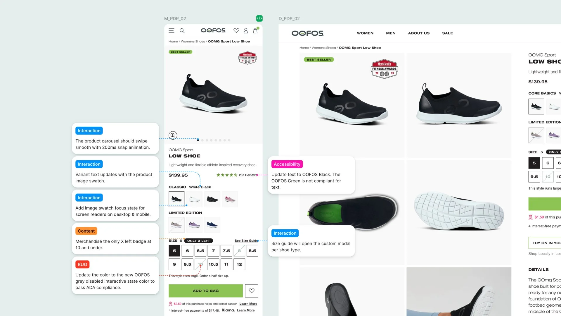Above the fold I redesigned the OOFOS experience to have a more immersive visual product detail page with a image gallery style layout with video functionality. Updating the color variants to image thumbnails. I convinced the client to re-merchandise their product catalog to reduce naming length and increase SEO impact. Building a strategic, robust, and engaging page.