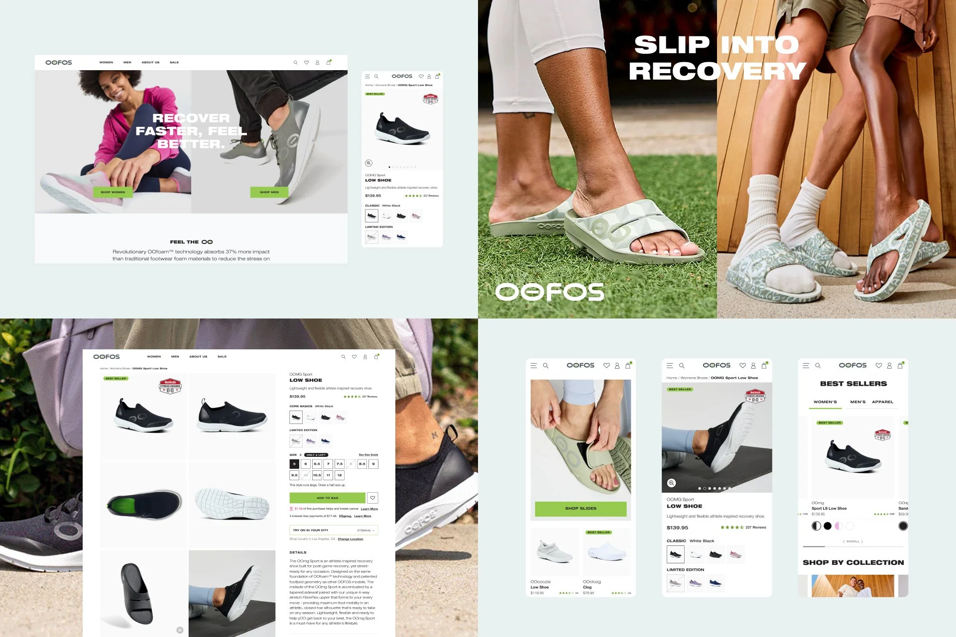Further down the page I created many net-new sections to further build out content to support the products features and the OOFOS brand. Content includes product technology, testimonials, product awards, brand beliefs, reviews, related products, and FAQs all further supporting the credibility of the product.